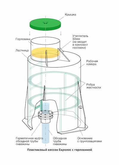 Конструкция изготовлена из монолитного полипропилена толщиной 8 мм, с усилением дна ячеистой полипропиленовой плитой толщиной 80 мм. Кессон имеет герметичную пластиковую конструкцию с ребрами жесткости, встроенной лестницей и крышкой. Его основание снабжено грунтозацепами. В зависимости от своего назначения кессон может быть дополнительно оснащен муфтой обсадной трубы, которая обеспечивает герметичное соединение со скважиной. При использовании изделия в качестве дополнения, например к колодцу, внутри может размещаться: насосное оборудование, фильтры, гидроаккумулятор, запорная арматура, а также разведение трубопровода в разных направлениях, что позволяет сократить затраты на подключение дополнительных потребителей.